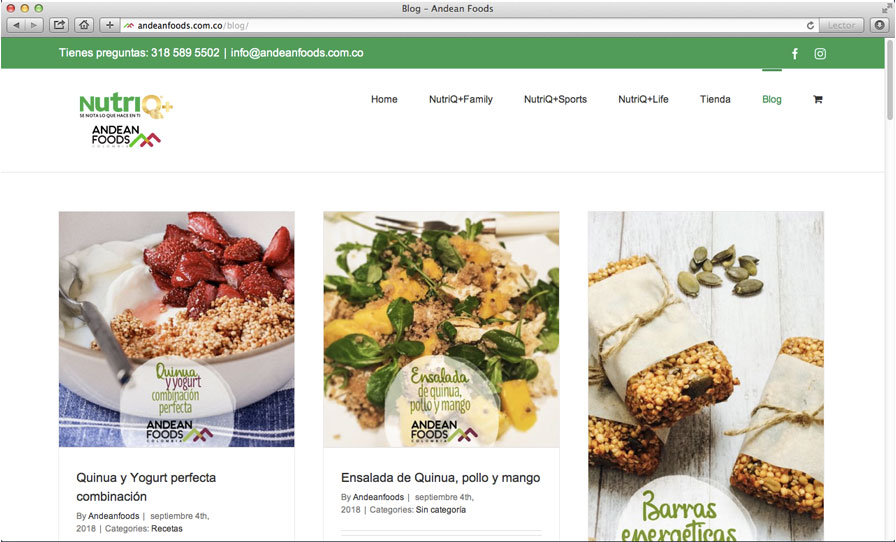 Objetivo: Implementar un sitio web con un carrito de compras interactivo, para vender sus productos y recibir pagos online. Complementado también con un blog donde se publica gran variedad de recetas a base de quinua. Además un sistema de atención al cliente en línea.